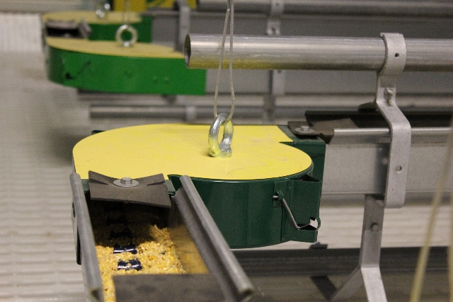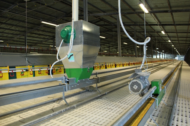 Бункер для распределения пищи оснащен устройством для регулирования уровня подачи, что предотвращает потери.