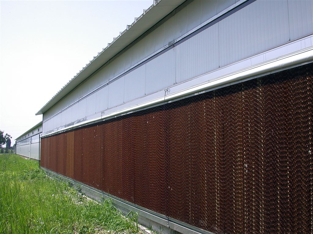 Эта система охлаждения обеспечивает отличные условия внутри фермы, особенно в жарких и сухих климатических условиях. Основан на принципе испарения воды. Наружный воздух всасывается системой вентиляции и охлаждается через панели из целлюлозы, мокрые от воды. Таким образом, при свежем воздухе который поступает в ферму, снижается внутренняя температура.